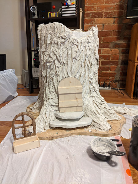 Quarantine project, cardboard structure, paper mâché, and tissue paper flowers